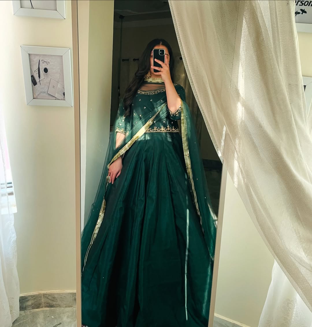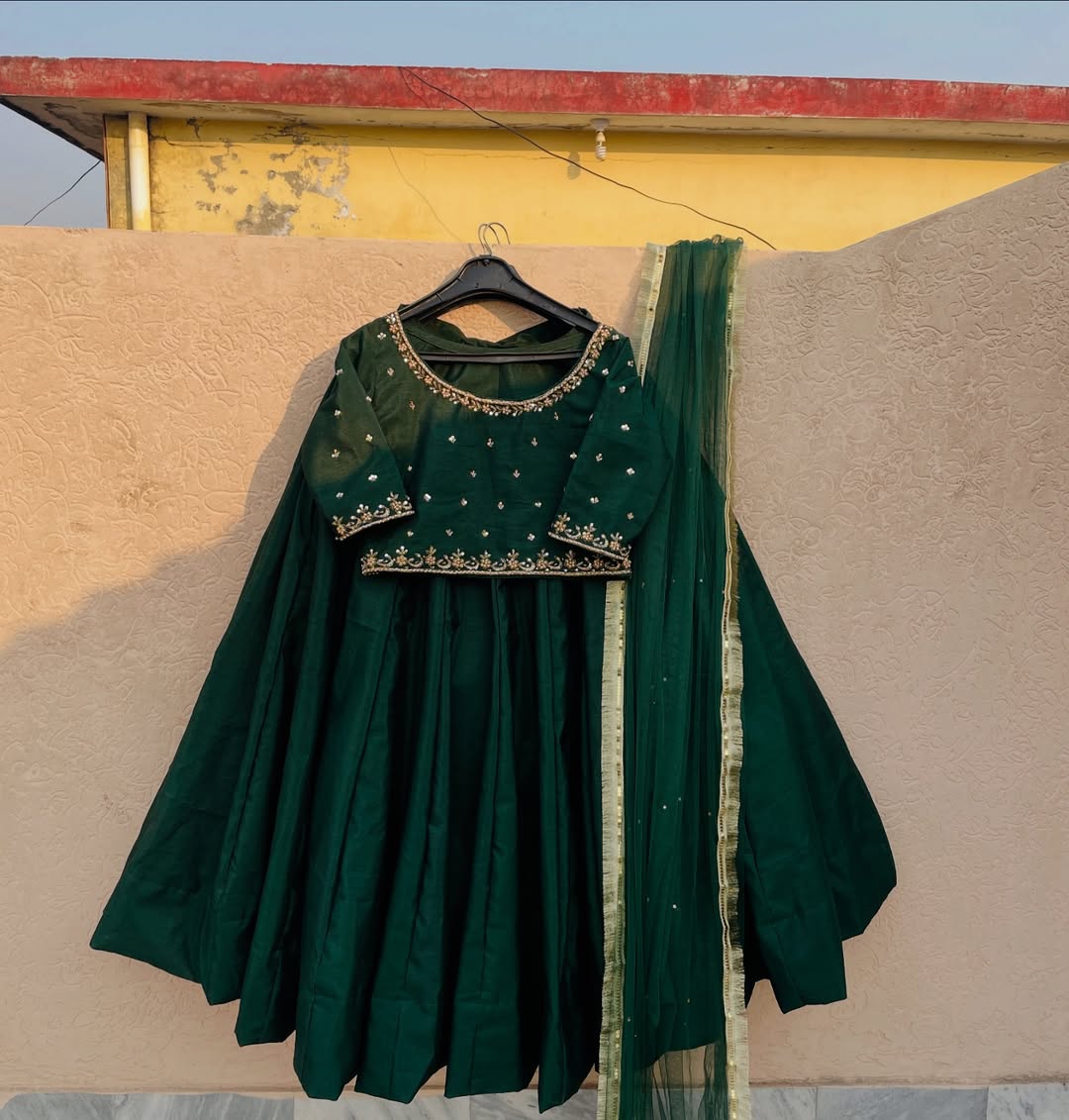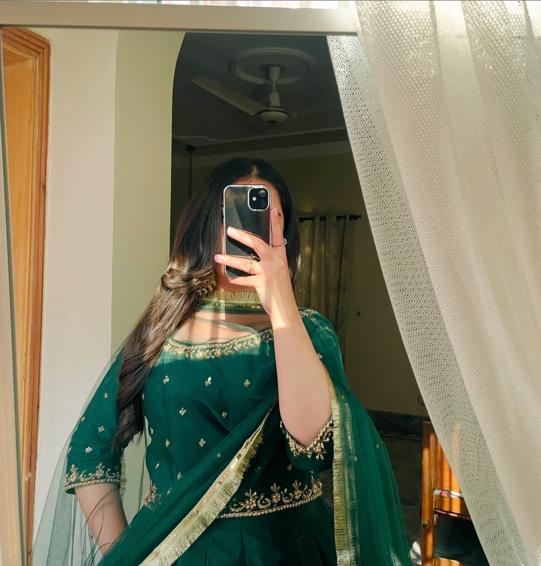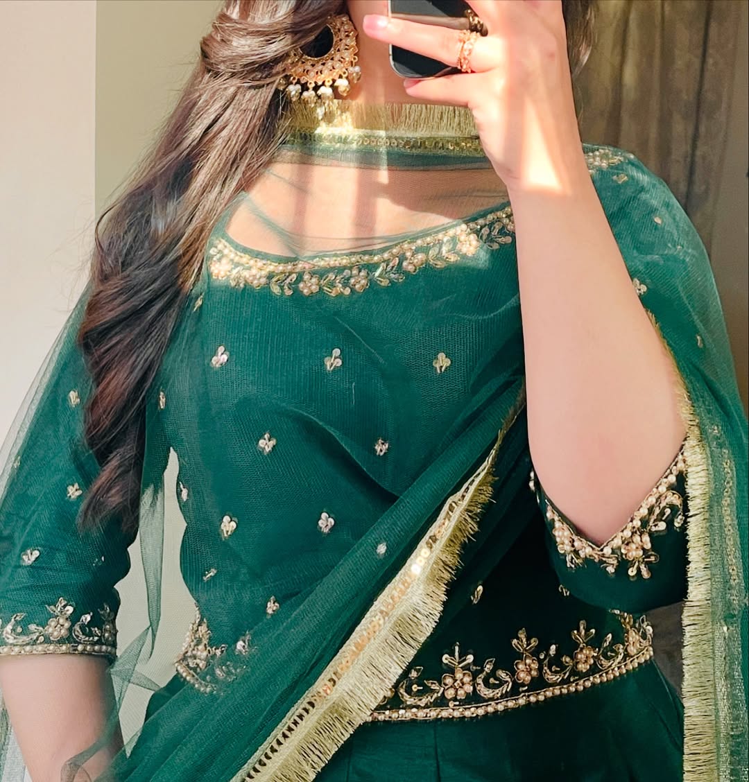 Elevate your wedding attire with Aida, a beautiful 3-piece Lehenga Choli. Made from high-quality silk fabric, this outfit is perfect for your special day. Upgrade your wedding look with Aida and feel confident and elegant as you celebrate your love.