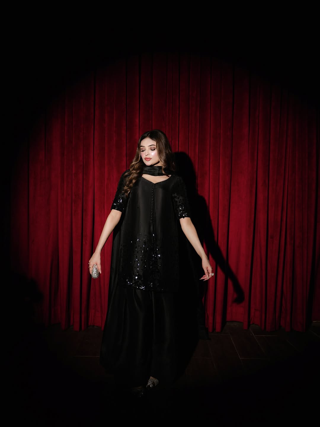 Unleash your inner diva with this 3-piece ensemble! Made from luxurious silk fabric and hand embellished with Ada work and stone detailing, each piece is hand-crafted for a unique touch. Effortlessly chic and ready to wear, it's the perfect combination of elegance and playfulness.