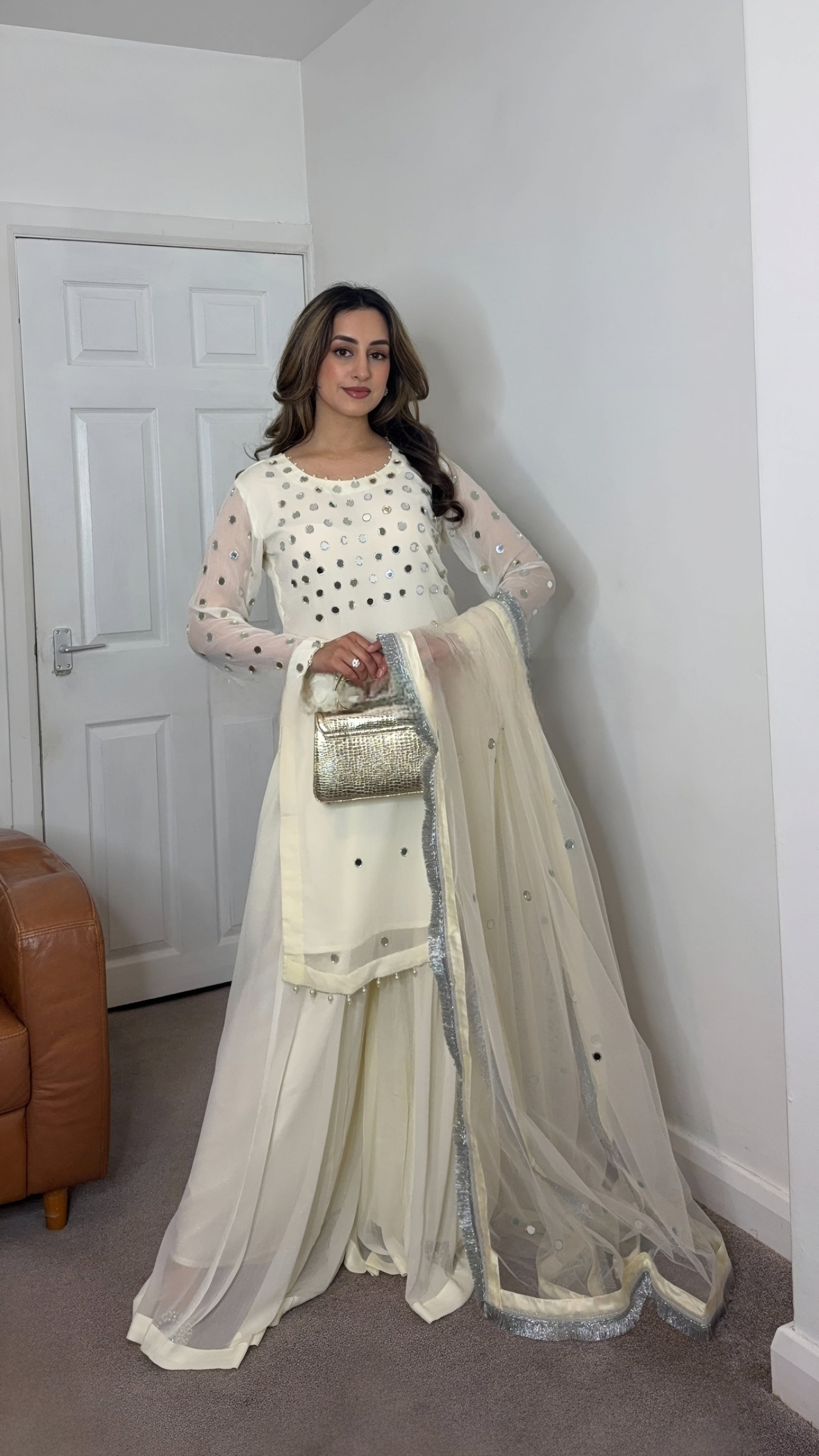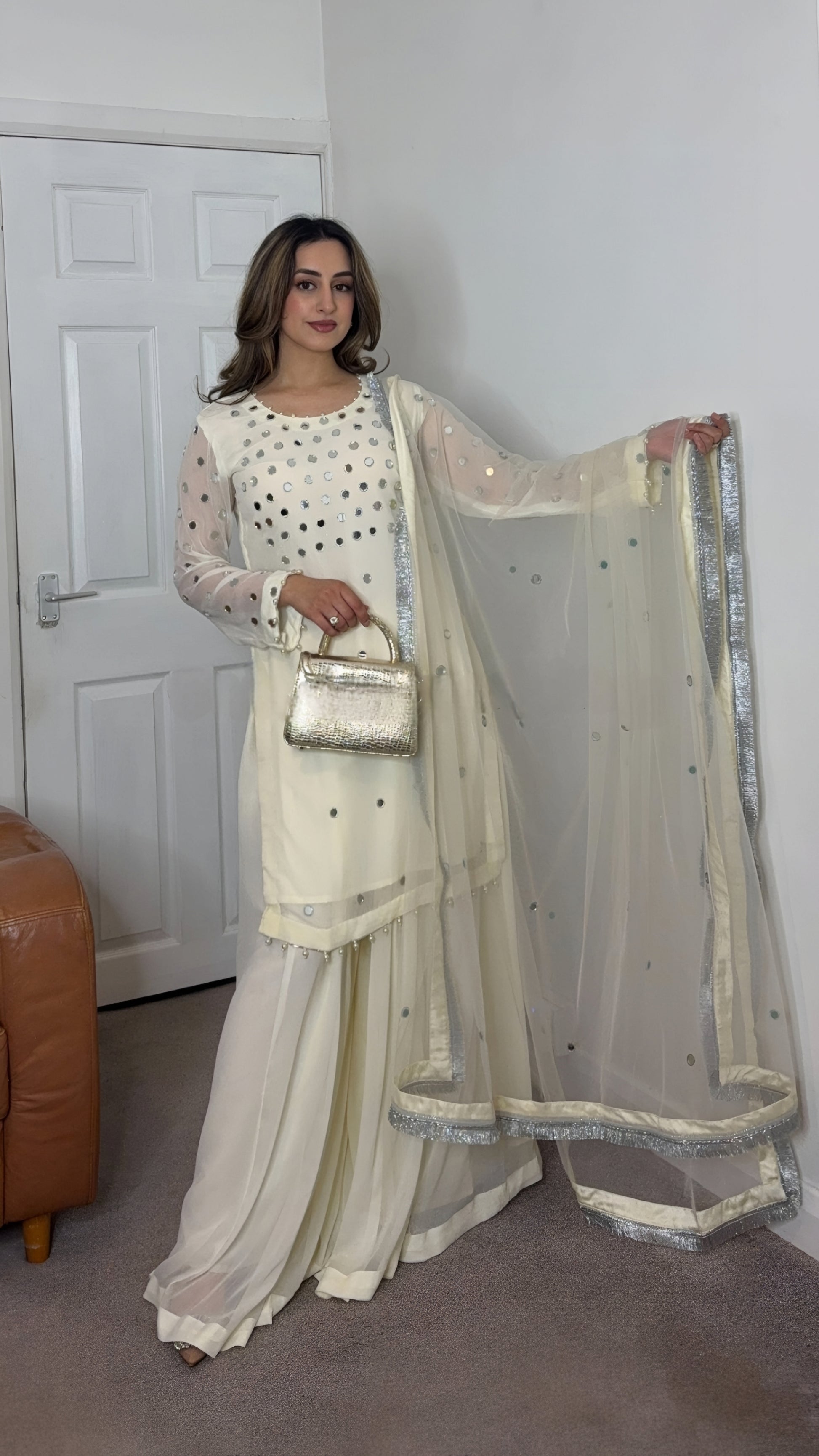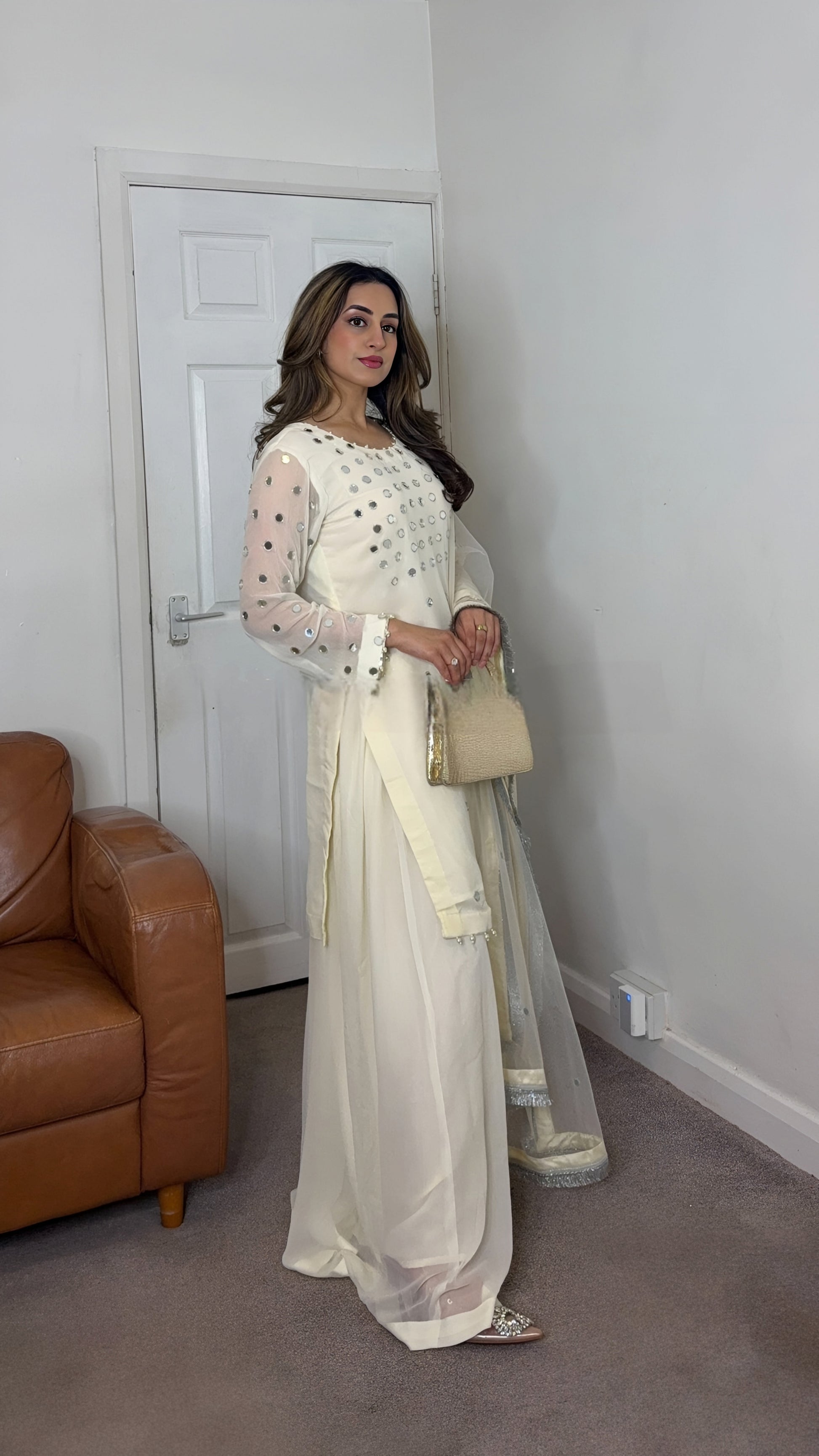 Indulge in luxury with Lyla, a stunning 3 piece set crafted from delicate chiffon fabric. Adorned with intricate hand work and a mirror accent, this ensemble exudes elegance and sophistication. Elevate your style and make a statement with Lyla.